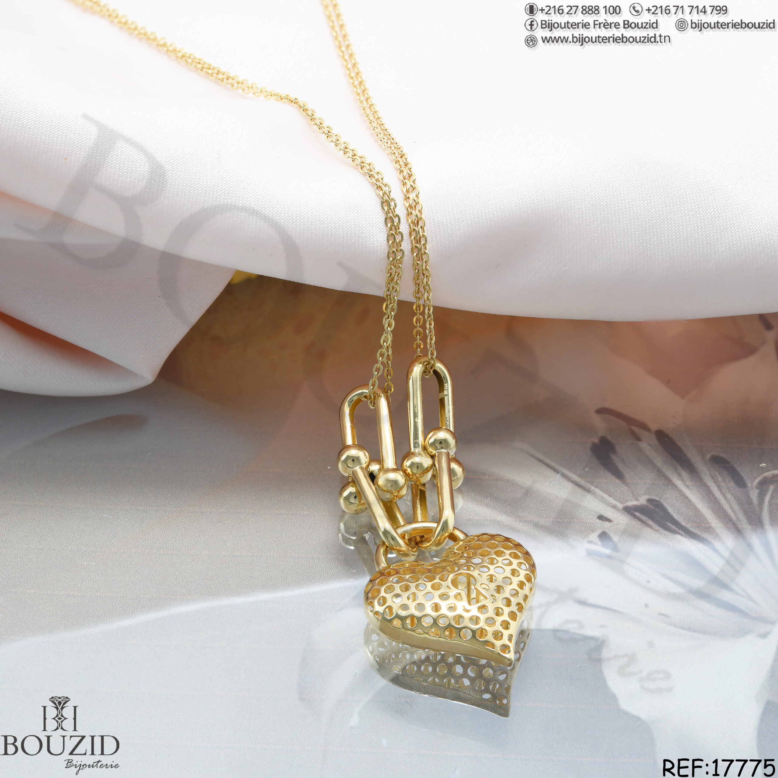 Affirmez votre style avec un collier en or 18K au design moderne et symbolique. Chez Bijouterie Frères Bouzid, chaque collier de cette collection exprime une idée forte. Les pendentifs sont conçus pour marquer l’élégance et la personnalité de la femme qui le porte.