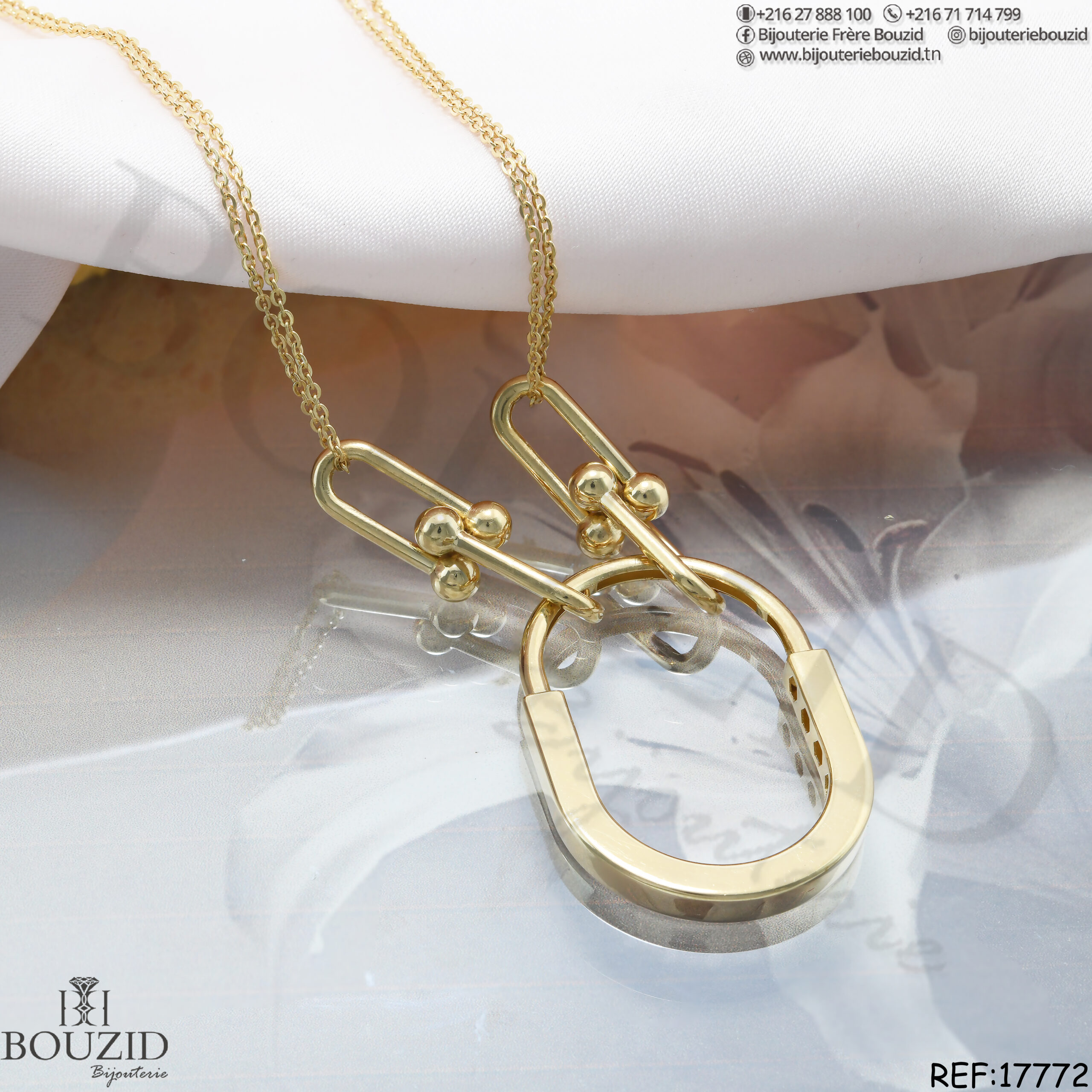 Les références 17772 et 17773 adoptent la forme d’un fer à cheval. Ce symbole porte-bonheur évoque la réussite et la chance. Les détails sont travaillés avec soin, et les maillons qui relient le pendentif à la chaîne apportent une touche audacieuse. Le double anneau accentue le contraste entre finesse et structure.