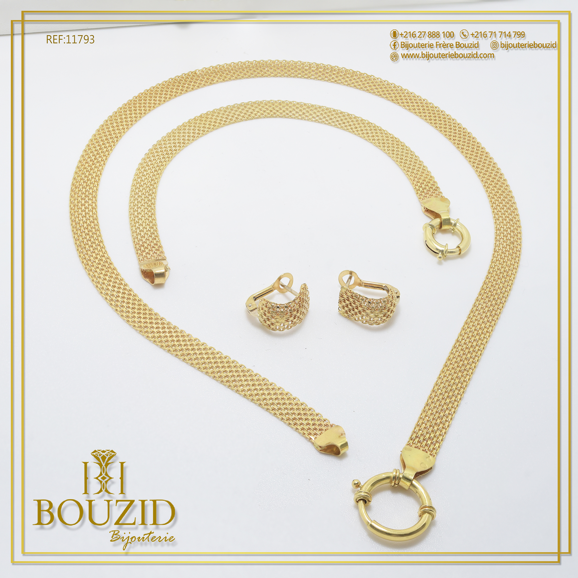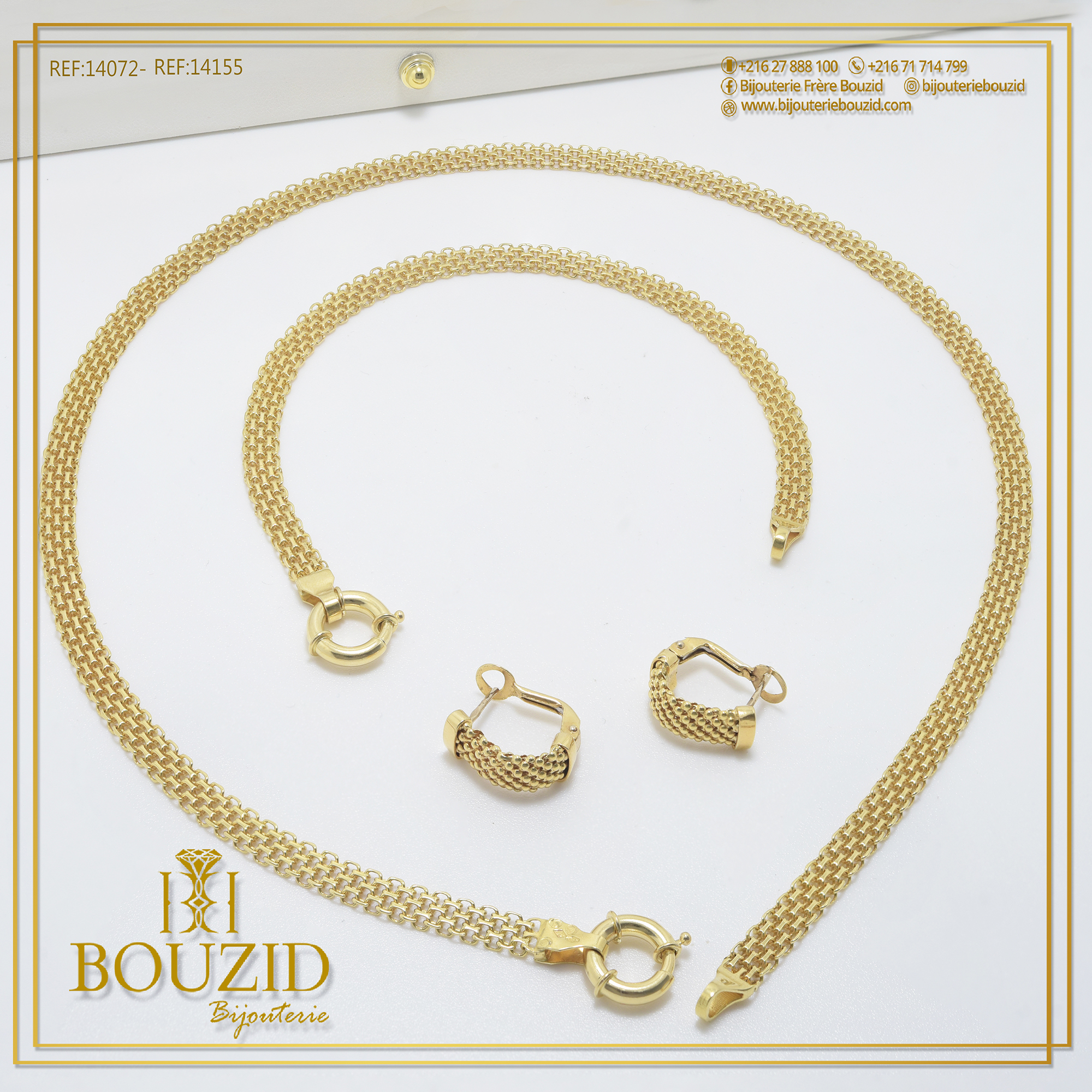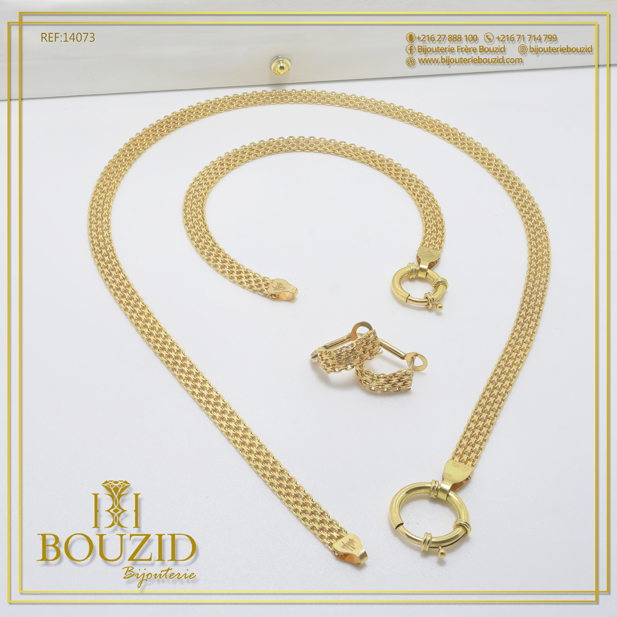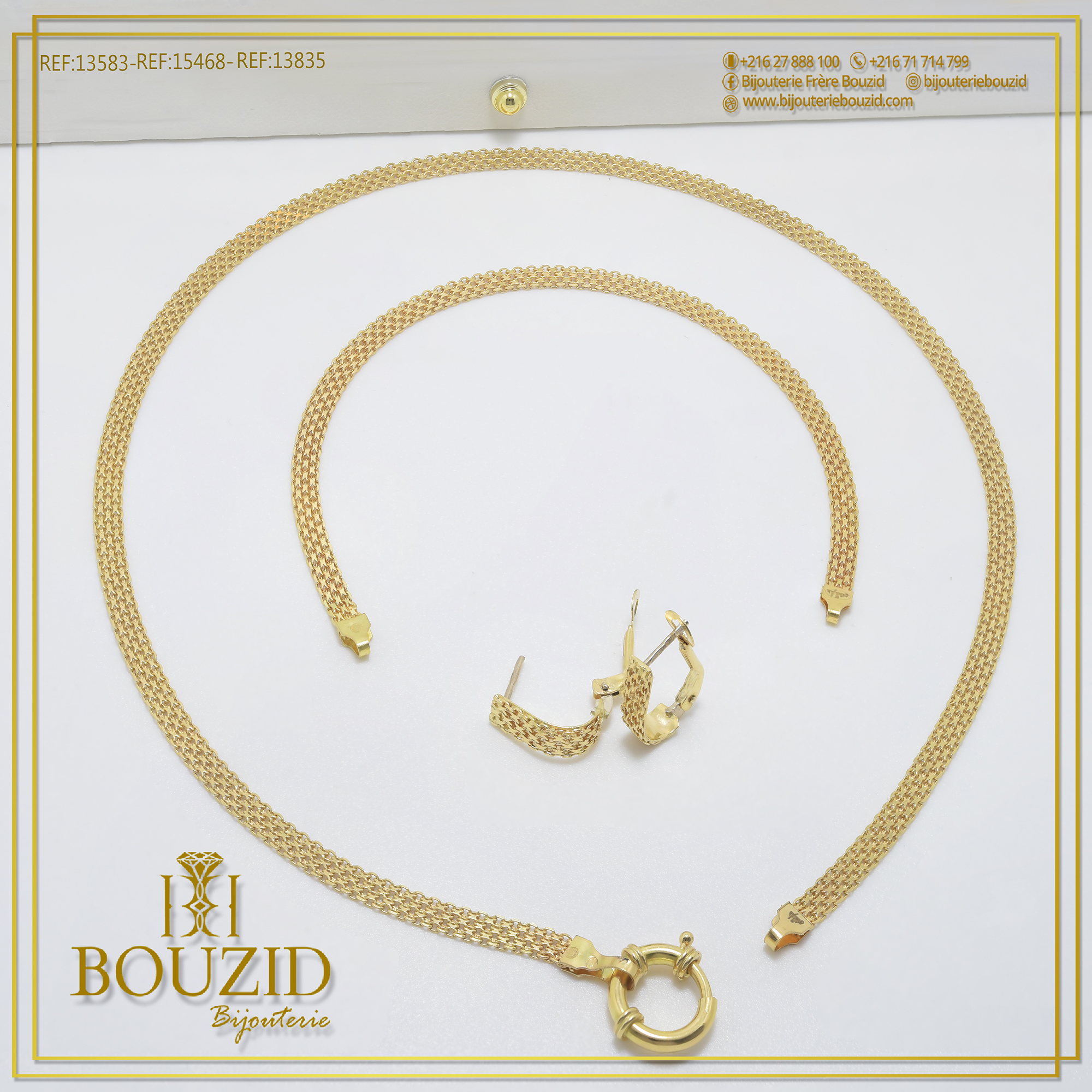 Composée d’un collier, d’un bracelet, de boucles d’oreilles et d’une bague (réf. 15335), cette parure se distingue par son équilibre entre design traditionnel et allure moderne. Le travail minutieux de l’or 18 carats garantit une finition impeccable, à la fois brillante et durable. Ainsi, chaque élément peut être porté seul ou en ensemble, selon vos envies.