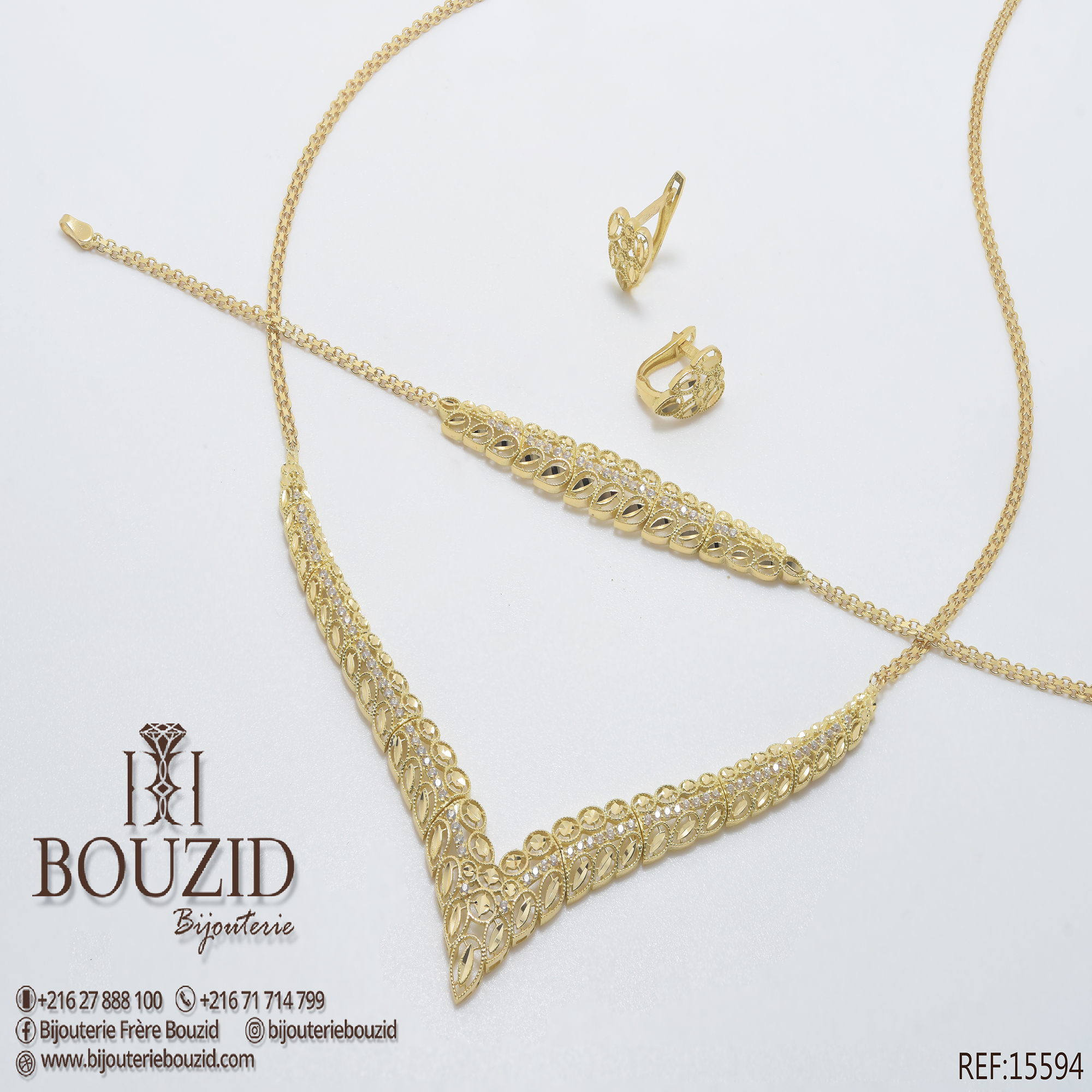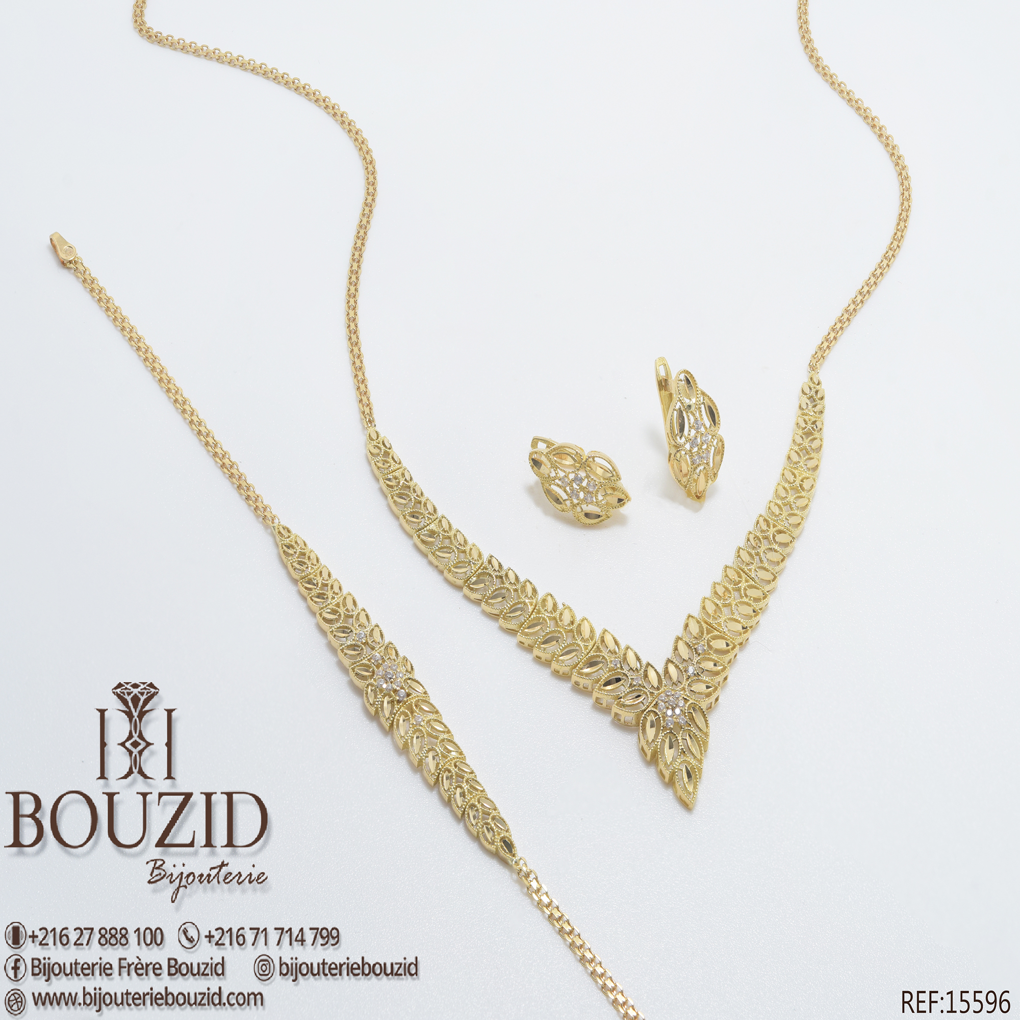 Découvrez la finesse d’un bijou d’exception avec cette parure en or jaune 18K, imaginée par la Bijouterie Frères Bouzid. Inspiré par la nature, ce modèle se distingue par son motif feuille finement ciselé. Chaque élément de la parure – collier, bracelet, bague (réf. 15335) et boucles – évoque légèreté, harmonie et raffinement.