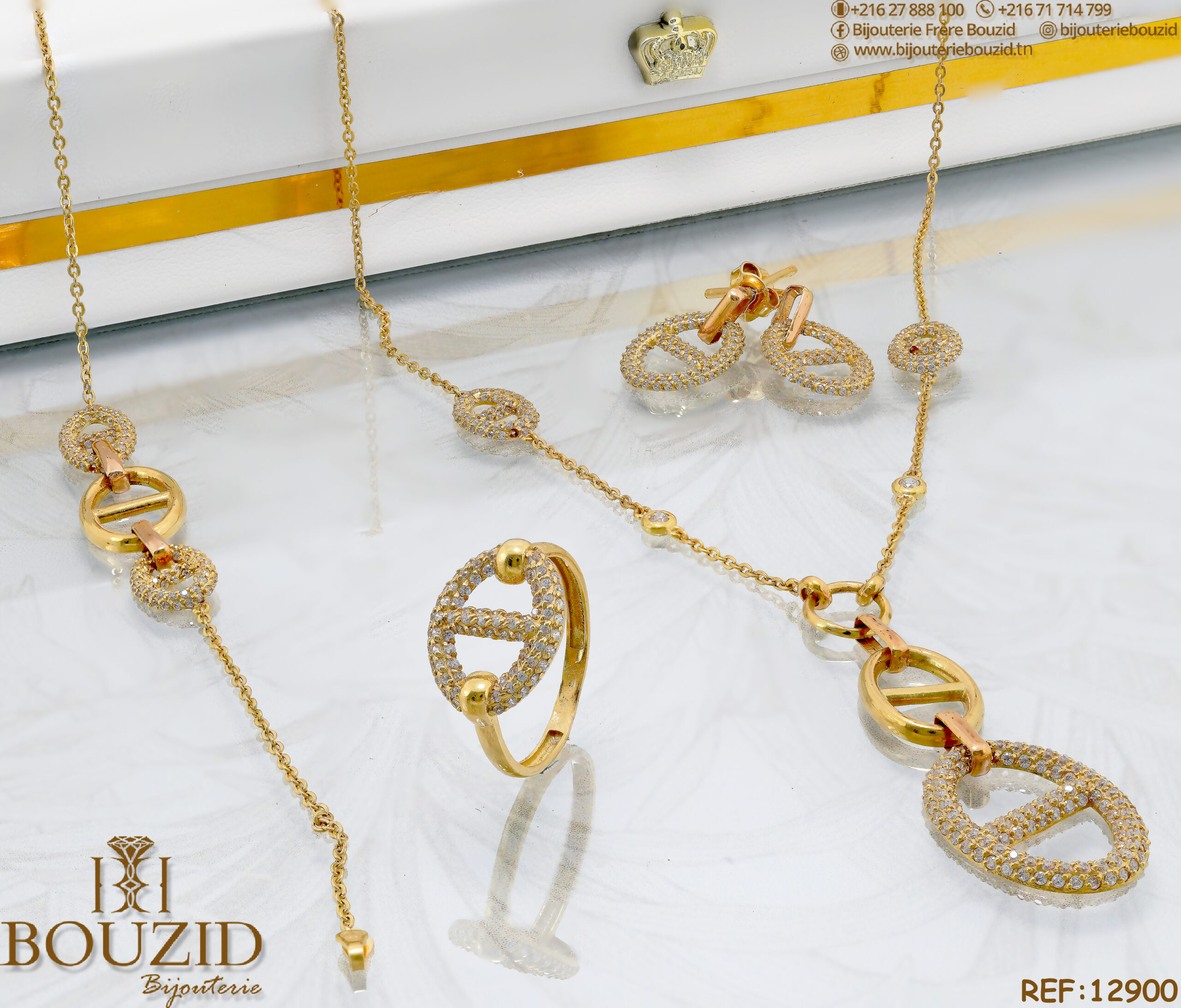 Le second modèle (REF : 12900) incarne la modernité. Ses maillons ronds sont sertis de zircons qui captent magnifiquement la lumière. Le collier structure le décolleté avec élégance. Les boucles complètent parfaitement l’ensemble, idéal pour une soirée ou une occasion spéciale.