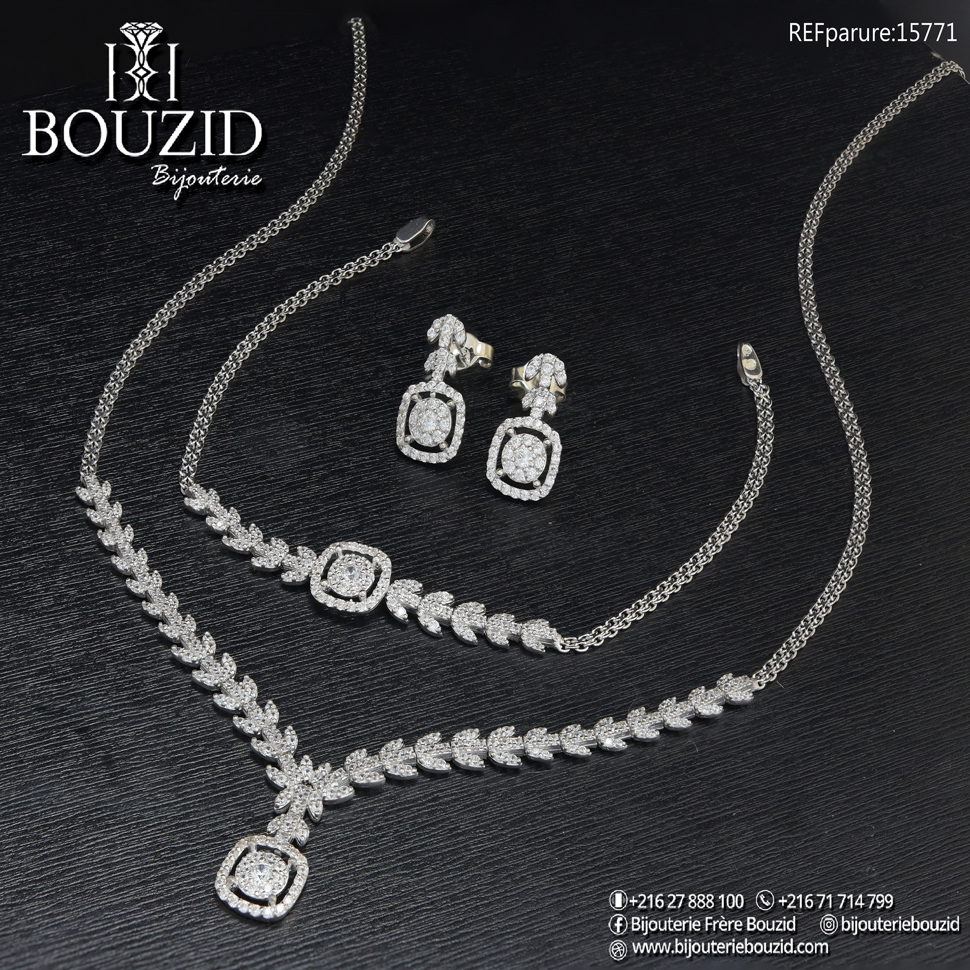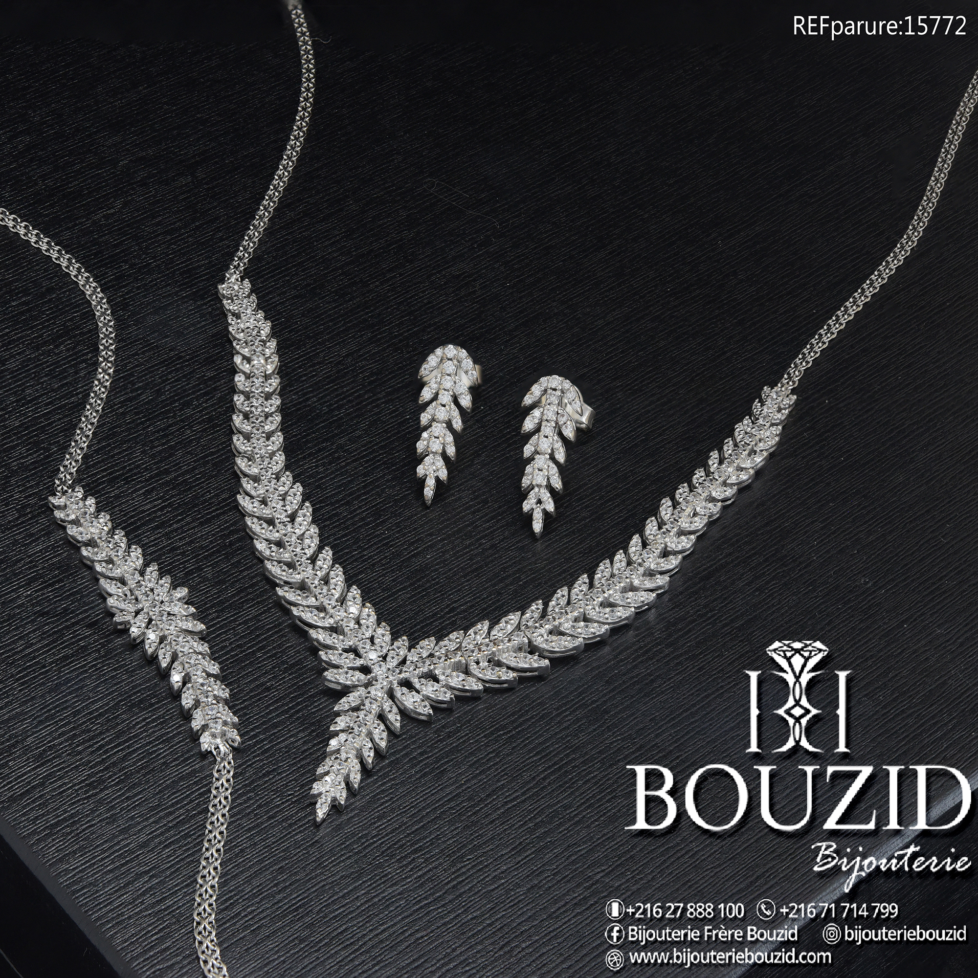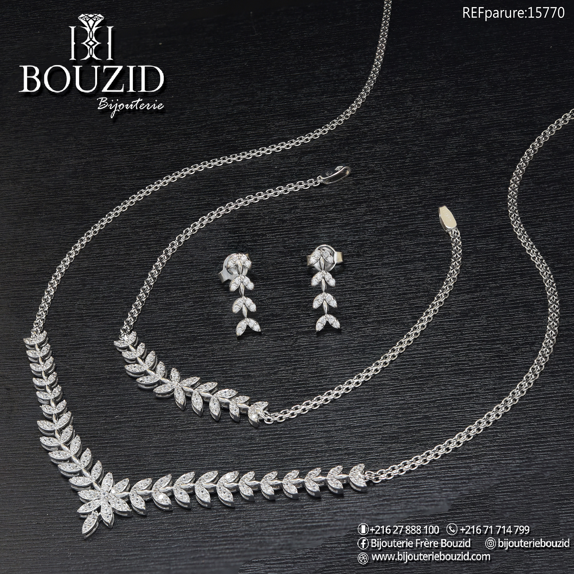 Parure Or Blanc 18K – Motif Feuille Étincelant | Bijouterie Frères Bouzid Tunisie